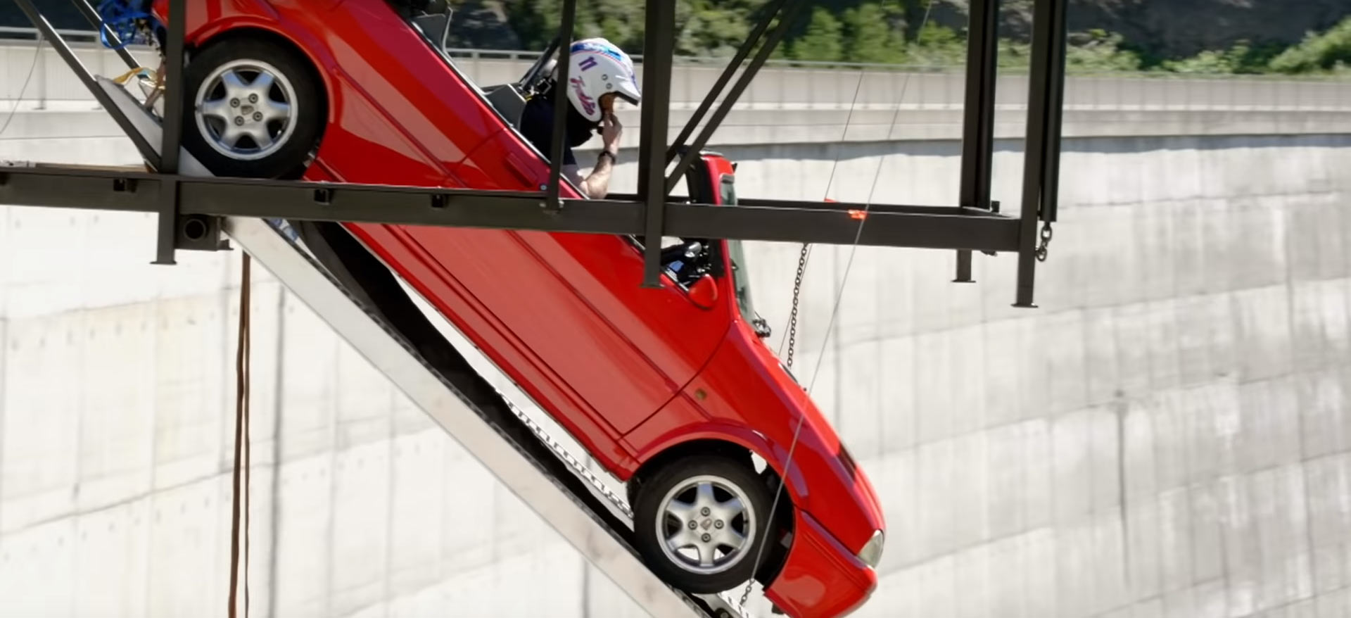 While the time doesn’t provide a lot of context, it starts by showing Freddie Flintoff hanging over the two sides of a Swiss dam while sitting in a Rover Metro Convertible. It’s apparently part of a bungee jump stunt which experiences the multitude being removed virtually 500 feet( 152 rhythms ).