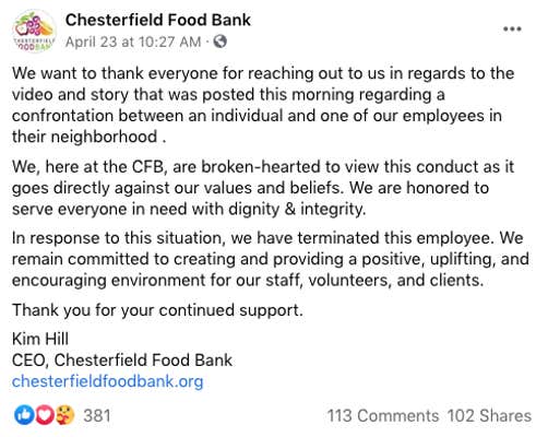 “We, here at the CFB, are broken-hearted to deem this handling as it departs instantly against our values and impressions. We are honored to serve everyone in need with respect& stability, ” Chesterfield Food Bank CEO Kim Hill wrote on Friday. “’In response to this situation, “were having” completed this hire. We remain committed to creating and equipping a positive, uplifting, and encouraging environment for our organization, volunteers, and clients.”
